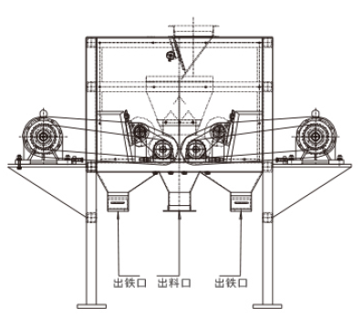 将物料均匀的送到磁选区域后,在设备的磁选区受到重力和磁场力的作用下,利用物料的磁性差异有不同的运动轨迹实现分离,磁性矿物被吸附在磁辊表面旋转到达精矿区,毛刷将吸附在磁辊表面上的磁性矿刷脱。