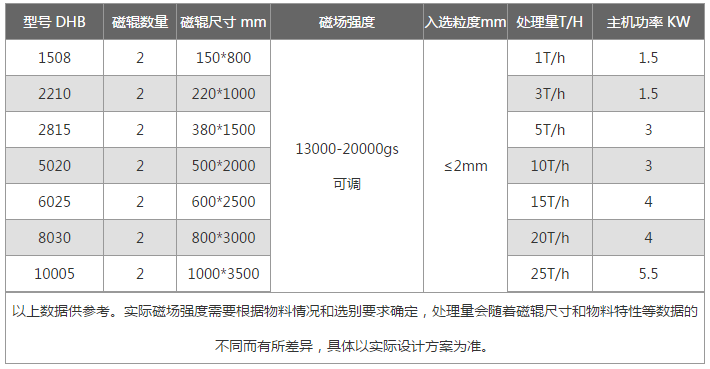 该机对粉矿率较少但又均匀的中小颗粒状矿石分选效果好,生产效率高,操作简单方便。适用于硅粉、石英石、锆石、长石等细粒级的非磁性矿石去除磁性物提纯作业。